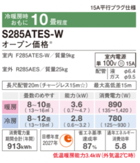 ダイキン Eシリーズ 10畳用 (S285ATES-W)