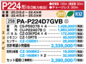 Panasonic XEPHY Premium 高天井用1方向カセット型 P224型 同時ダブルツイン PA-P224D7GVBC