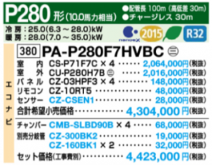 Panasonic XEPHY Eco 天井ビルトインカセット型 P280型 同時ダブルツイン PA-P280F7HVBC