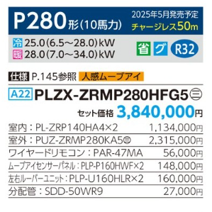 三菱 スリムZRi-スクエアタイプ 4方向天井カセット形<同時ツイン> P280形 (PLZX-ZRMP280HFG5)