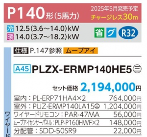 三菱 スリムERi-スクエアタイプ 4方向天井カセット形 <ツイン> P140形 (PLZX-ERMP140HE5)