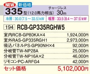 日立 省エネの達人 プレミアム 天井ビルトインカセット形 <フォー> P335形 (RCB-GP335RGHW5)