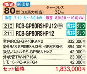 日立 省エネの達人 天井ビルトインカセット形 <ツイン> P80形 (RCB-GP80RSHPJ12/RCB-GP80RSHP12)