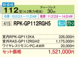 日立 省エネの達人 プレミアム 壁掛型 <シングル>P112形 (RPK-GP112RGH5)