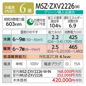 三菱 ルームエアコン Zシリーズ 6畳用 (MSZ-ZXV2225)