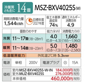 三菱 ルームエアコン BXVシリーズ 14畳用 (MSZ-BXV4025S)