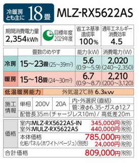 三菱 ルームエアコン 一方向天井カセット型 RXシリーズ 18畳用 (MLZ-RX5622AS)