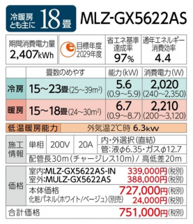 三菱 ルームエアコン 一方向天井カセット型 GXシリーズ 18畳用 (MLZ-GX5622AS)