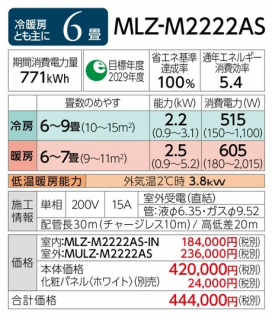 三菱 ルームエアコン 一方向小能力天井カセット型 Mシリーズ 6畳用 (MLZ-M2222AS)