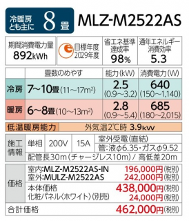 三菱 ルームエアコン 一方向小能力天井カセット型 Mシリーズ 8畳用 (MLZ-M2522AS)