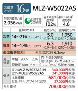 三菱 ルームエアコン 二方向天井カセット型 Wシリーズ 16畳用 (MLZ-W5022AS)