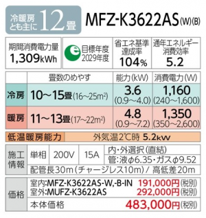 三菱 ルームエアコン 床置型 Kシリーズ 12畳用 (MFZ-K3622AS)