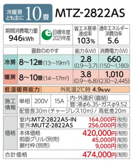 三菱 ルームエアコン 壁埋込型 10畳用 (MTZ-2822AS)