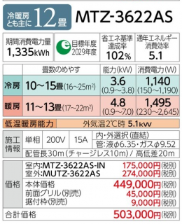 三菱 ルームエアコン 壁埋込型 12畳用 (MTZ-3622AS)