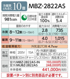 三菱 ルームエアコン フリービルトイン型 10畳用 (MBZ-2822AS)