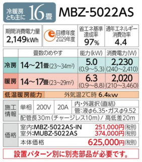 三菱 ルームエアコン フリービルトイン型 16畳用 (MBZ-5022AS)