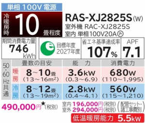 日立 ルームエアコン XJシリーズ 10畳用 (RAS-XJ2825S)