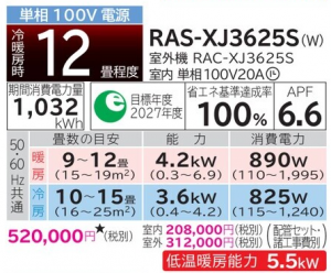 日立 ルームエアコン XJシリーズ 12畳用 (RAS-XJ3625S)