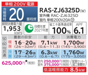 日立 ルームエアコン ZJシリーズ 20畳用 (RAS-ZJ6325D)