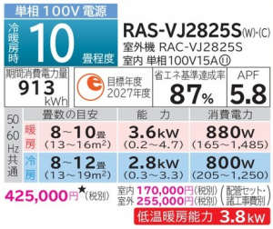 日立 ルームエアコン VJシリーズ 10畳用 (RAS-VJ2825S)