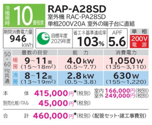 日立 ルームエアコン 一方向カセット型 PAシリーズ 10畳用 (RAP-A28SD)